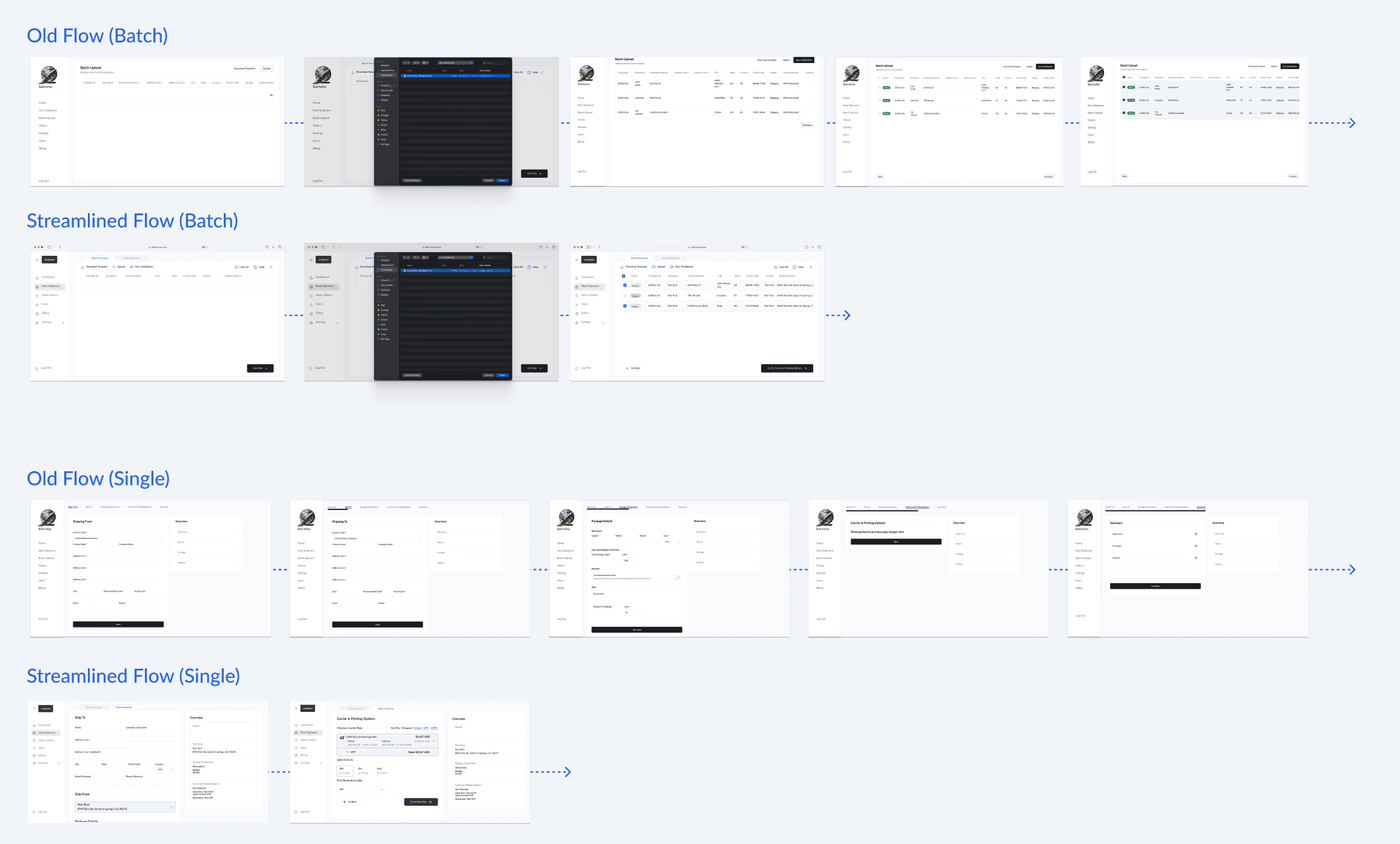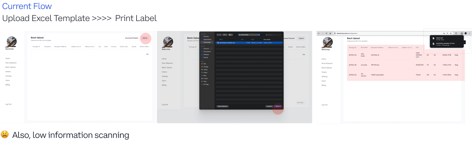 By comparing the workflows side-by-side, I identified excessive steps in the label printing and batch upload process.