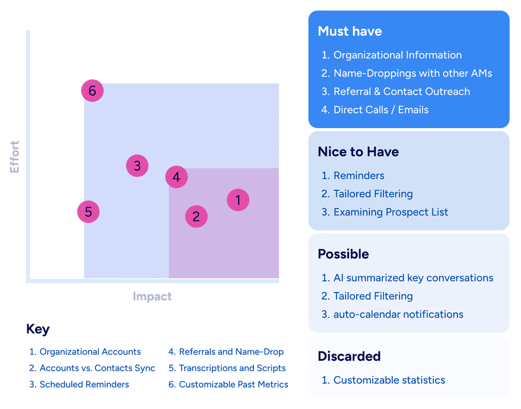 Aligning with the stakeholder, we prioritized the most important 3 MVP feature user flow based on value and effort.