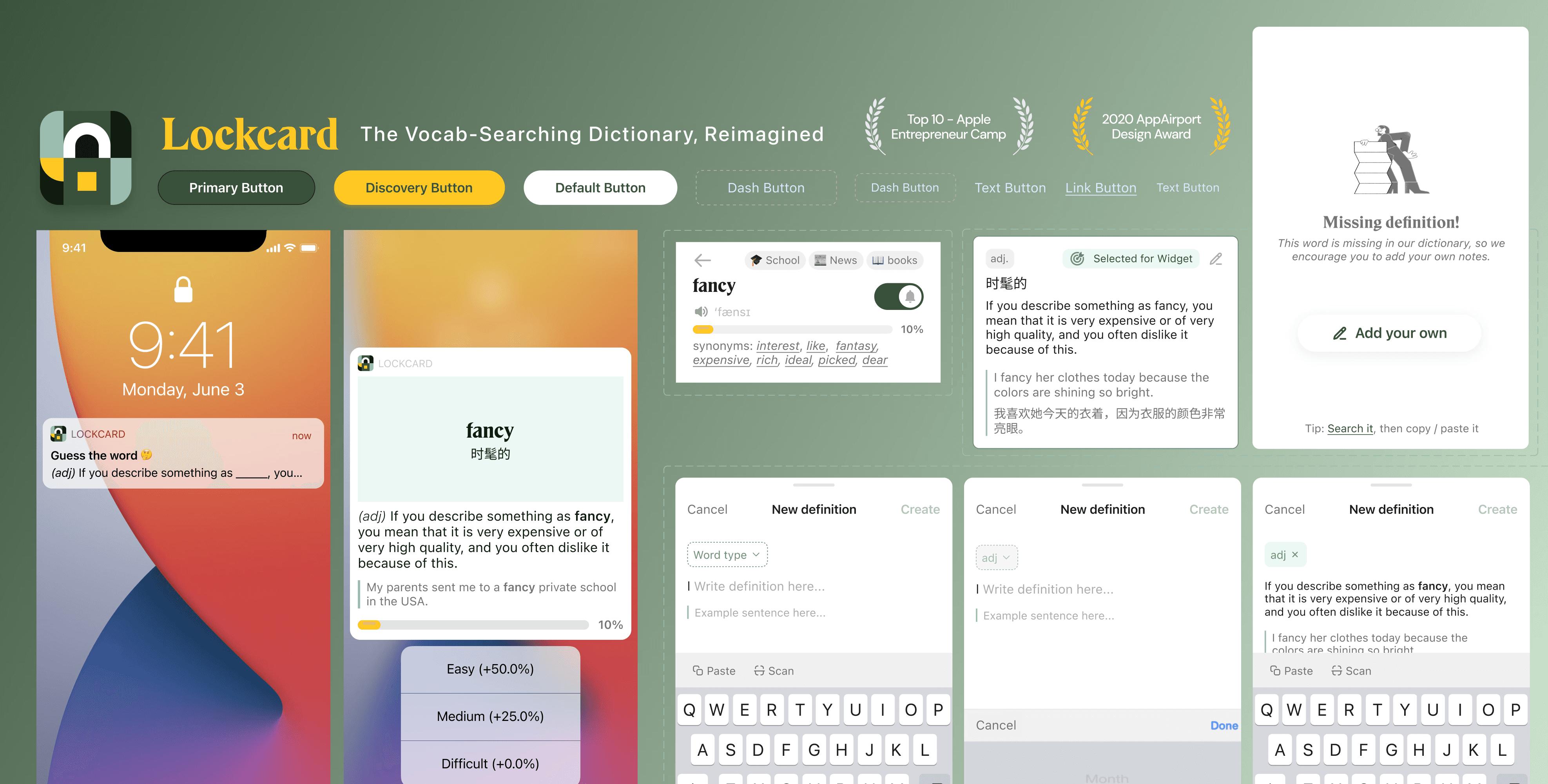 Lockcard is a recall app for searching and reviewing new English vocabulary through spaced repetition and micro-interactions in notifications and widgets. It has been on the App Store since 2020 and is a Top 10 app in the Apple Entrepreneur Camp.