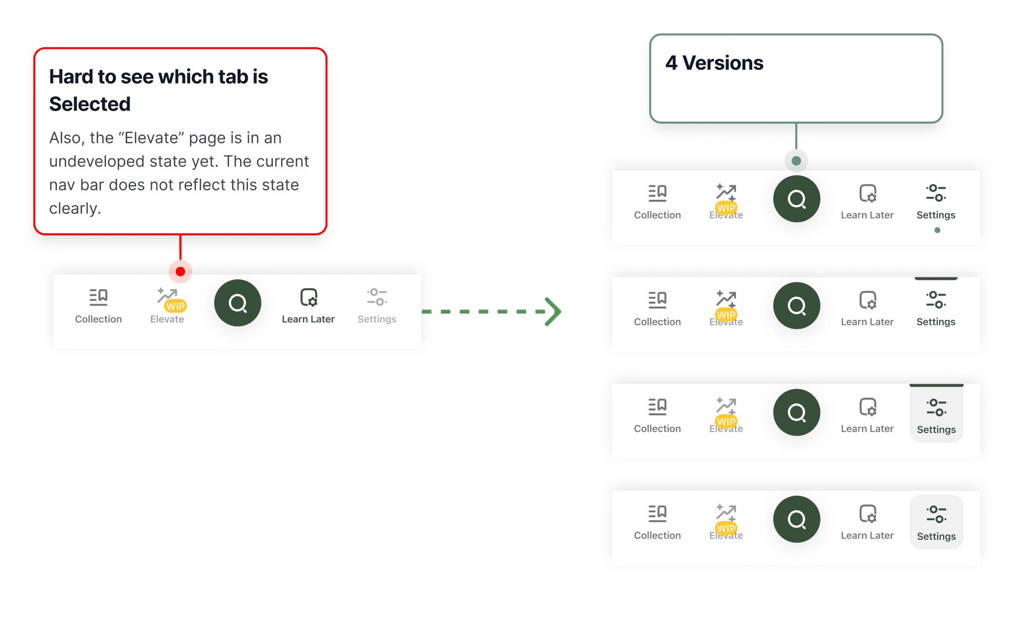 I find it hard to see the variance of differnet tabs solely by looking at the navigation bar. I looked at existing mobile products and proposed four visual solutions, with the 1st one being the most preferred by the founder.